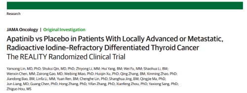 2021年12月16日,权威医学杂志《JAMA Oncology》(影响因子31.777)在线发表阿帕替尼的一项III期临床研究(REALITY)——甲磺酸阿帕替尼片治疗局部进展/转移性放射性碘难治性分化型甲状腺癌(RAIR-DTC)患者的多中心、随机、双盲、安慰剂对照临床研究。此研究由北京协和医院的林岩松教授和南京金陵医院的秦叔逵教授发起,在全国21个研究中心展开,由G22恒峰医药中央医学事务部团队支持完成。
